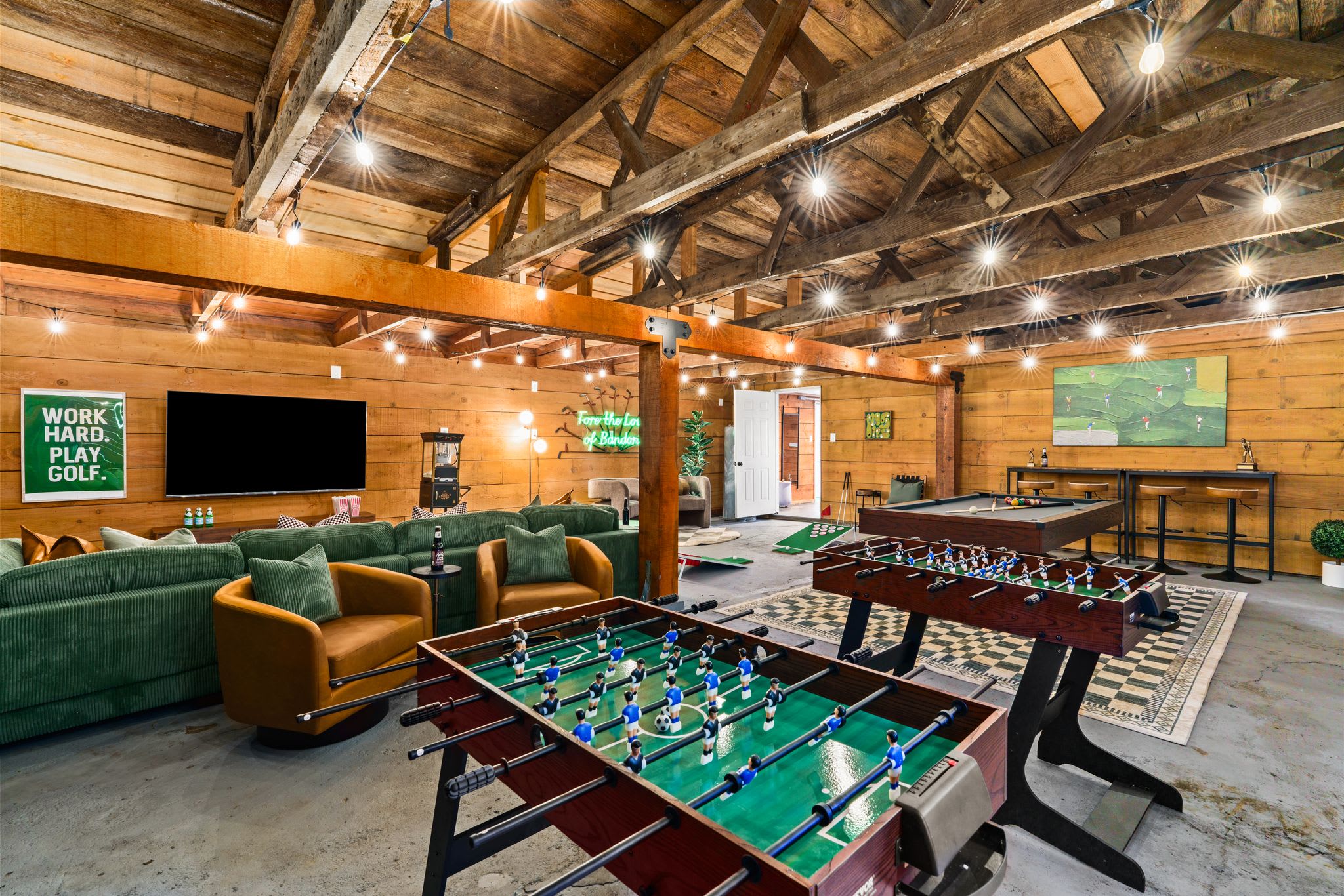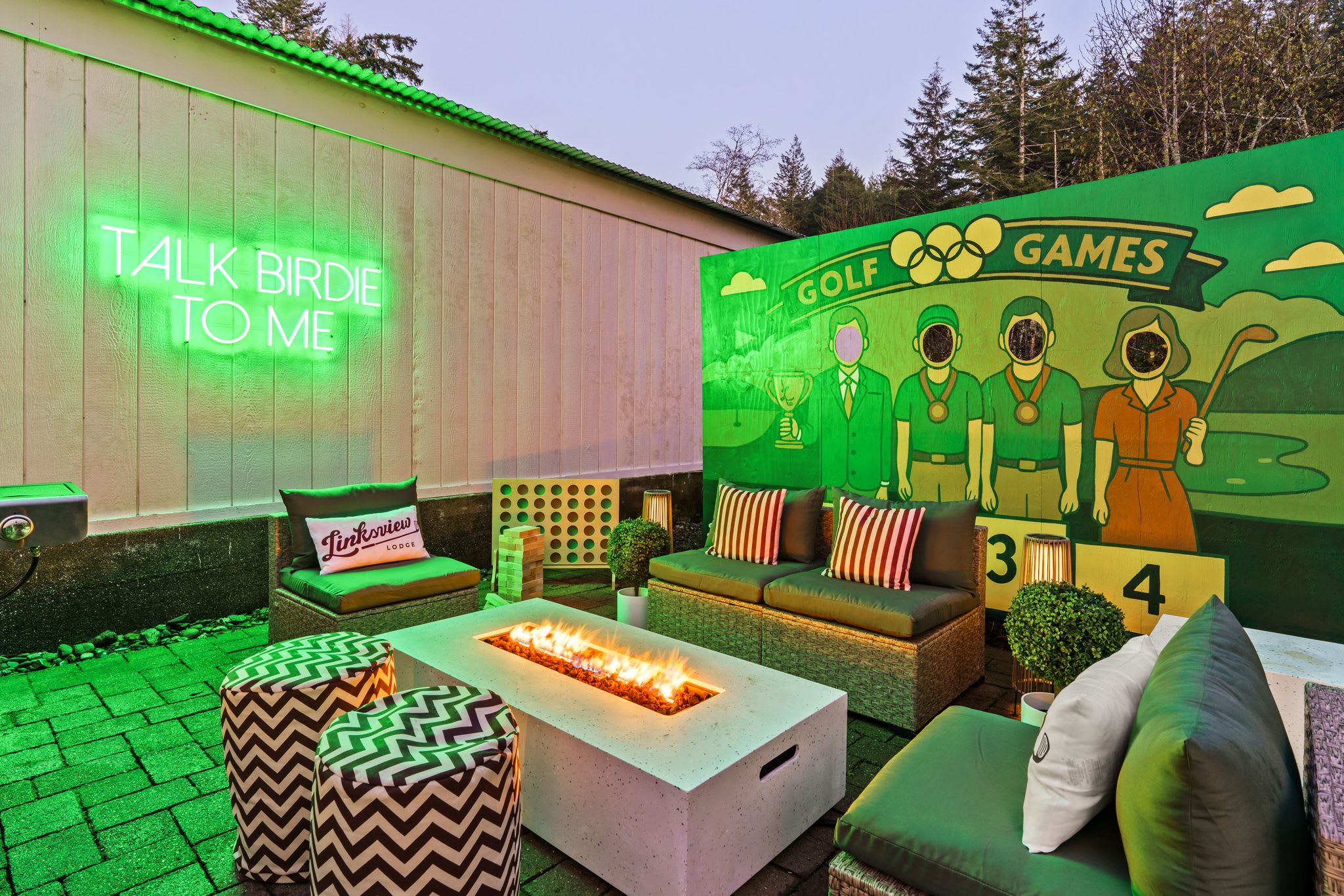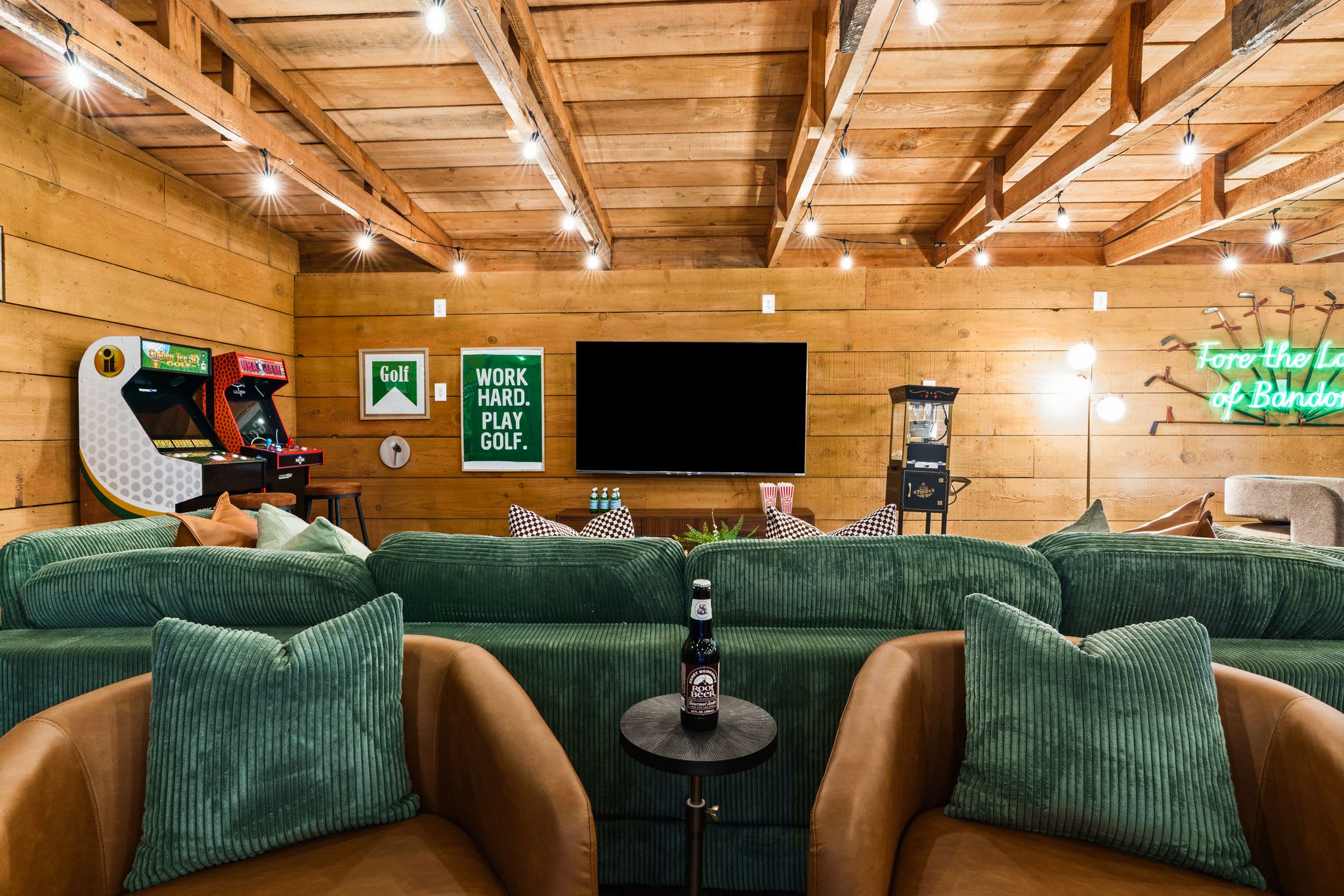 🏌️♂️🔥 Welcome to Linksview Lodge, where golf vibes meet ultimate relaxation. This 4-bed, 4-bath retreat is built for groups who love to play and unwind. Enjoy the sauna, hot tub, and cold plunge, then gather by the fire pit or outdoor dining area. Inside, kick back in the game room, indoor bar, and sports-bar-style hangout. The golf simulator (coming soon) and putting green make this the perfect getaway for golf trips or friend getaways. ⛳✨